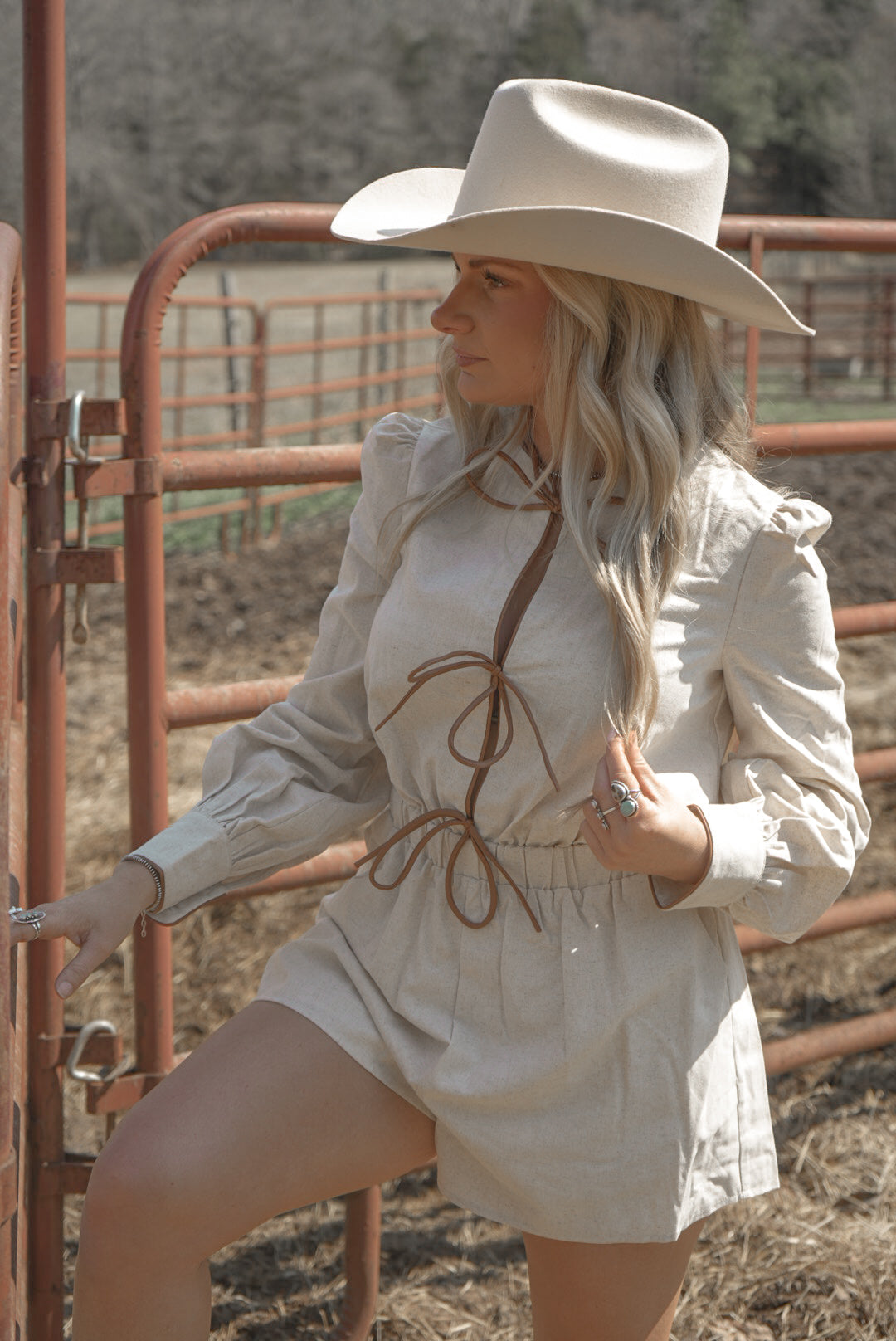 Effortless with a touch of western charm. The Saddle Tie Romper features lightweight linen fabric and faux leather tie details down the front for the perfect rustic touch. Easy to dress up or down with boots or sandals for an effortless everyday look.